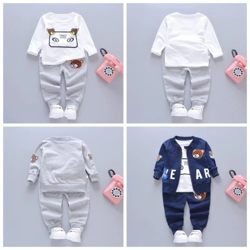 Setelan 3 potong untuk anak laki-laki: T-shirt lengan panjang + jaket ritsleting lengan panjang + jins lembut sabuk elastis